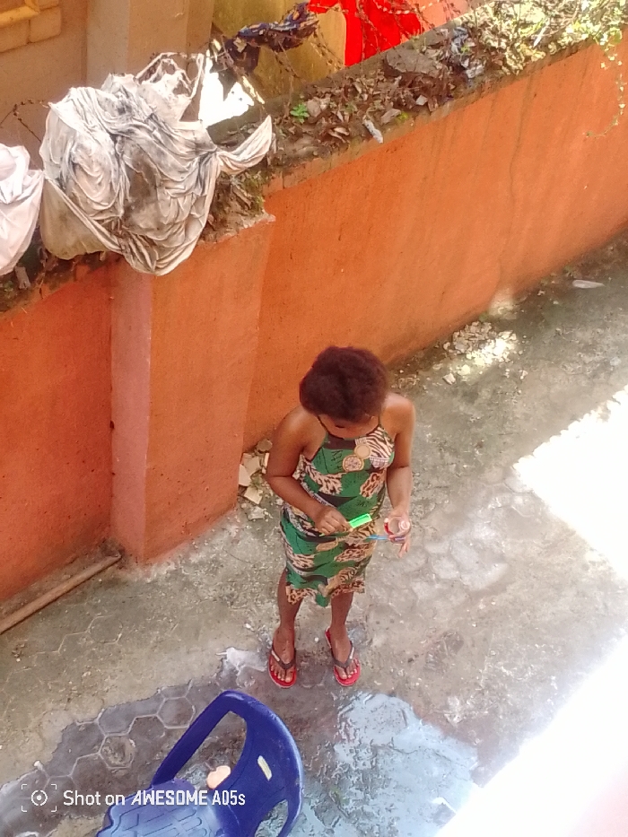 The image depicts an outdoor area in Awka, Nigeria, from a high-angle perspective. A young female, viewed from above, stands on a concrete surface. She wears a green halter-neck dress with a patterned design including animal print and circular motifs, and red and white flip-flops. She holds a light-green rectangular object in her left hand and a small, brown cylindrical container in her right hand. To the left and behind her is an orange-colored textured wall. The top of this wall bears debris, including crumpled white fabric, dry foliage, and dark, jagged fragments. The concrete ground is uneven, displaying cracks and patches of moisture, with a hexagonal pattern visible in the lower-left section. A blue plastic chair is partially visible in the bottom-left foreground. The scene is illuminated by direct sunlight, casting prominent shadows.