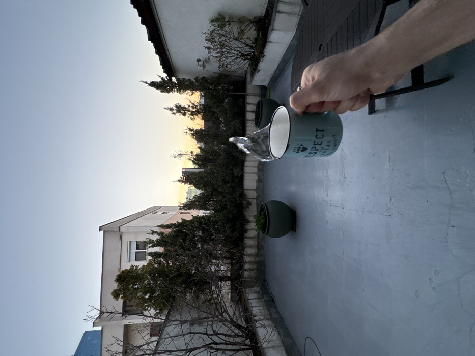The image depicts an urban rooftop terrace scene in Sofia, Bulgaria, during twilight hours. In the lower right foreground, a fair-skinned right hand, wearing a simple ring on the ring finger, holds a light blue enamel mug with a white rim. A significant splash of clear liquid is captured mid-air, actively rising from the mug's opening. The mug bears the text "RESPECT" and a paw print graphic on its side. The terrace floor is a light grey, presenting signs of wear, stains, and cracking. Two dark green spherical planters, each containing green foliage, are situated on the terrace surface. The perimeter of the terrace is bordered by a low concrete wall with coping stones, behind which a dense line of dark green evergreen trees stands, partially obscuring the background. To the immediate left, a multi-story building with a light-colored facade and a window featuring a white roller shutter is visible, along with a distinct blue structural element. To the right, a white stucco wall with a reddish-brown tiled roof edge and an exterior wall-mounted light fixture is present. A dark outdoor table and a portion of a chair are visible in the lower right corner. A black electrical cable lies on the terrace floor to the left. The sky overhead is a pale blue, transitioning to an orange-yellow hue near the horizon, indicating either sunrise or sunset, against which distant urban buildings are silhouetted.
