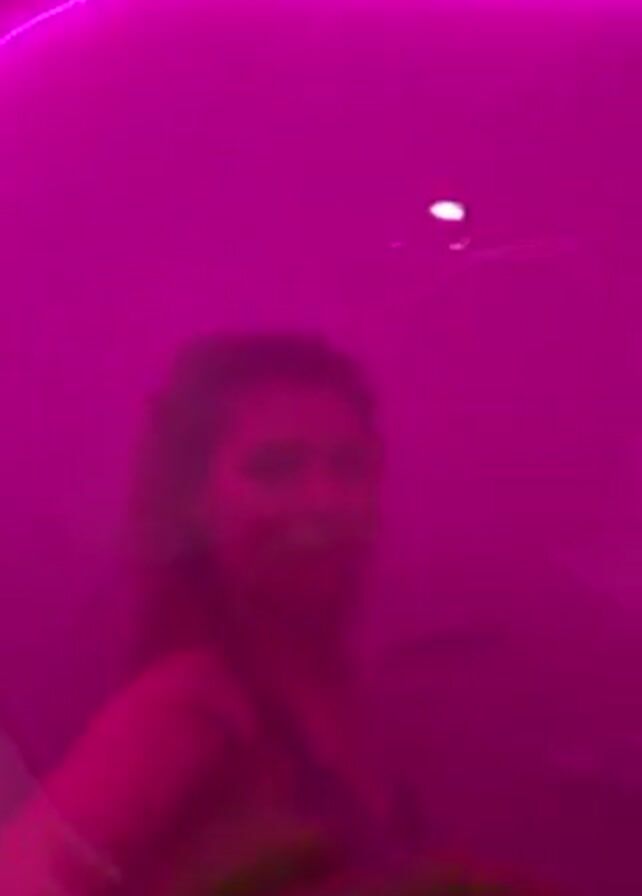 person in a room illuminated by bright pink lights. The person's image is blurred and distorted by the light. It is difficult to discern any specific details about the person or their actions. The lighting dominates the scene, making it hard to see any other elements in the environment clearly.