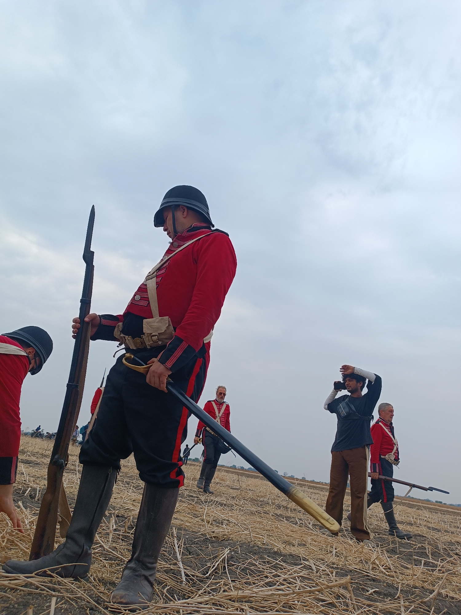 The scene depicts an open field in Kottalapalli, India, under an overcast sky. In the foreground, a male figure dressed in a red military-style coat with black trim, black trousers with red stripes, a black helmet, and tall dark boots stands, holding a long rifle with an attached bayonet upright in his left hand and a scabbarded saber with a brass hilt in his right. He wears a beige canvas belt with a pouch. To his immediate left, another individual in similar attire is partially visible, bending over. In the midground, a male individual in contemporary clothing, consisting of a black long-sleeved shirt, brown pants, white arm sleeves, and a black cross-body bag, holds a black smartphone horizontally near his head, appearing to film or observe. To his right, another male figure in a red military-style coat, black trousers, and boots walks towards the right, holding a rifle. Further in the background, a man with a white beard and glasses, also in a red uniform, is partially visible. The ground is a dry, harvested field covered with straw stubble and patches of exposed dark soil. Distant, indistinct figures and what appear to be motorcycles are visible along a far horizon line. The sky is uniformly light grey with cloud cover.