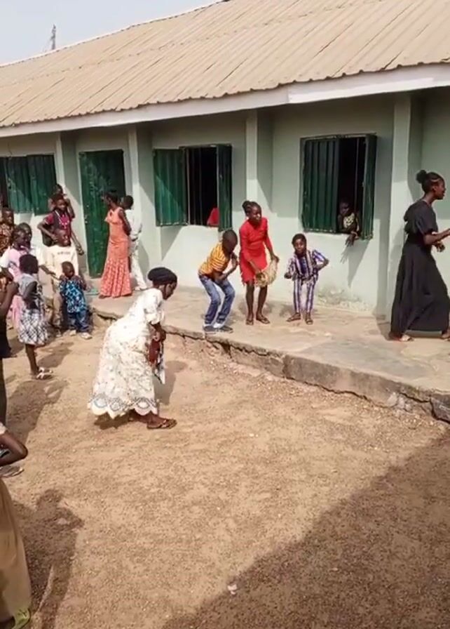 A group of children and adults are gathered in front of a building with green doors and window shutters. The building appears to be a school or community center. A woman in a white dress with floral patterns is dancing in the foreground, holding a red object in her hand. Behind her, several children are dancing on a concrete area in front of the building. A group of people are standing in front of the building, observing. Some faces can be seen looking out the windows. The ground is dirt. The weather appears sunny.