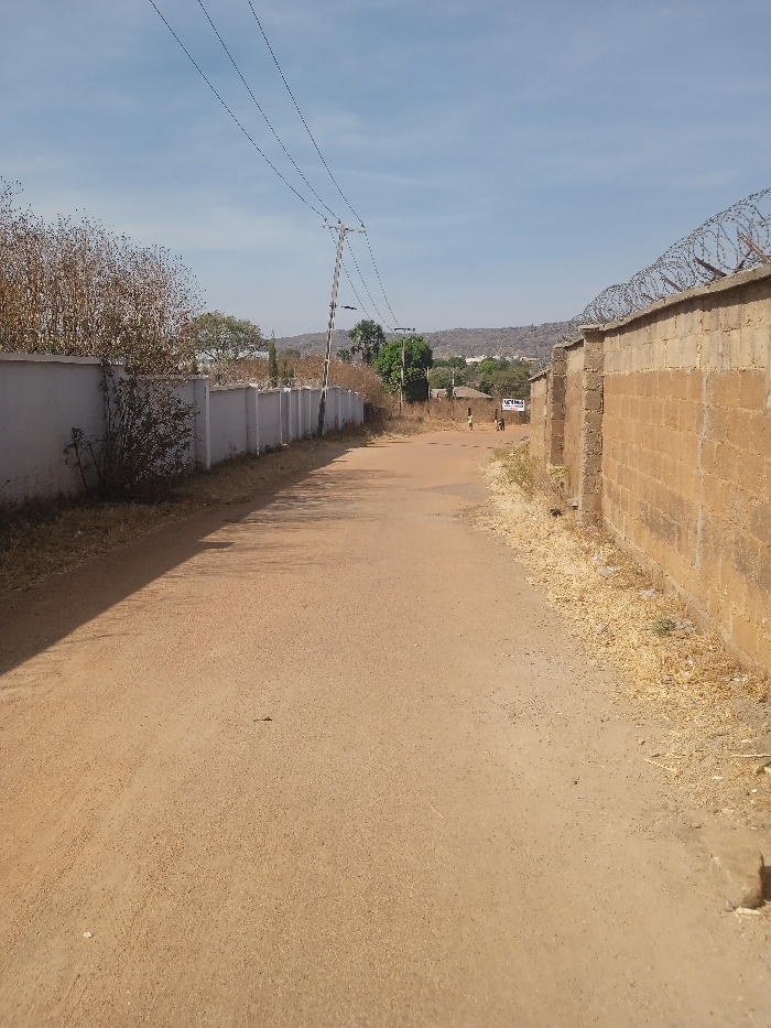 This image depicts a dry, unpaved reddish-brown dirt road extending into the distance under a clear, light blue sky in New Stadium, Nigeria. On the left, a low white wall, likely constructed from painted concrete blocks, runs parallel to the road, with sparse, dry vegetation visible both in front of and behind it. A utility pole supporting three power lines stands approximately midway down the left wall. Shadows are cast from the left side onto the road surface. On the right, a higher, unpainted tan concrete block wall is topped with coiled razor wire. Dry, yellowish grass lines the base of this right-side wall. In the mid-distance, near the right side of the road, a small white sign with dark lettering is visible near what appear to be structures. Two small, indistinct figures are present on the road or path further down, beyond the sign. Distant, hazy hills are visible on the horizon in the background. The scene is illuminated by bright daylight, indicating dry, arid conditions.