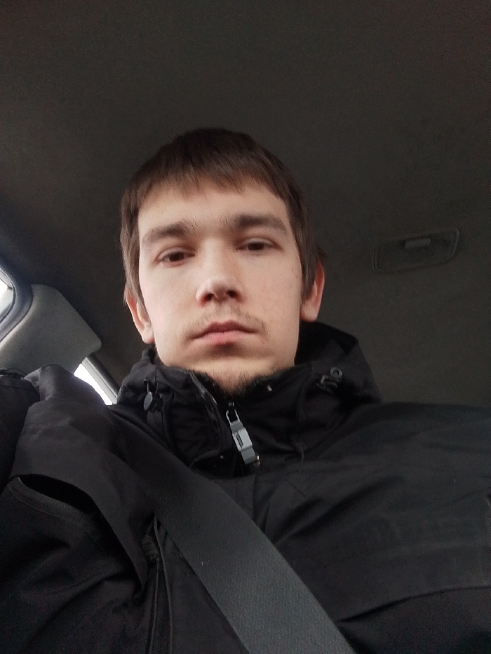 A young adult male, estimated 18-25 years old, with light complexion, short brown hair, light brown eyes, and minimal facial hair, is depicted in a close-up, chest-up shot. He is seated within the interior of a vehicle, looking directly at the camera with a neutral expression. He wears a black hooded jacket with a visible metallic zipper pull. A black vehicle safety belt is fastened across his chest and left shoulder. The vehicle's grey headliner and an overhead light console are visible in the background. A blurred, light-colored exterior, indicative of an overcast sky, is partially visible through a side window on the left. The scene provides no discernible landmarks or environmental features to determine a specific location within Saint Petersburg, Russia.