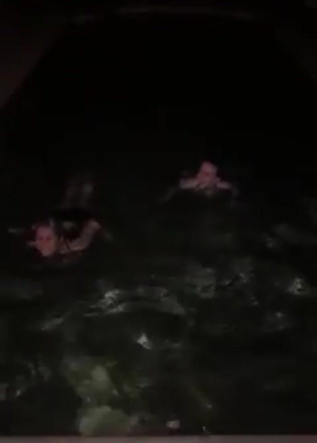 Two individuals are swimming in a pool at night. The pool appears dark, with the only light source reflecting on the surface of the water. The people are swimming towards the edge of the pool where the video is being recorded. They seem to be enjoying themselves, laughing and splashing in the water.