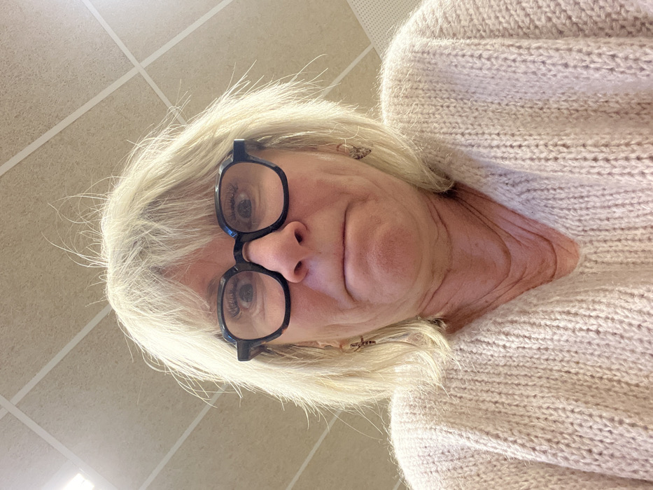 The image depicts a close-up, low-angle portrait of an adult female with fair skin, blonde, shoulder-length hair that appears slightly disheveled, and bangs. She wears large, dark-framed, possibly hexagonal or octagonal, glasses, through which her wide-open eyes are visible, along with apparent long eyelashes. Her mouth is closed, with lips pursed and the corners slightly downturned. Visible lines are present on her neck and facial creasing around her mouth and eyes. She wears gold-colored hoop earrings, with a small, darker charm visible on the right ear. Her attire consists of a light pink or beige V-neck sweater featuring a visible ribbed knit pattern. The background reveals a light-colored acoustic tile ceiling with a grid pattern and embedded light fixtures, indicating an indoor environment. The specific location within La Fouillouse, France, is not visually identifiable from the image content.