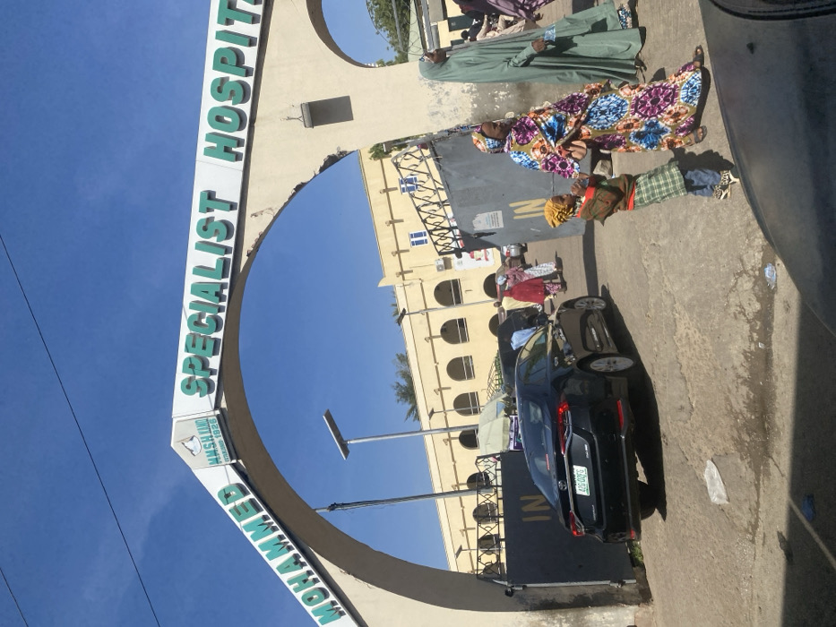 The image depicts the main arched entrance of Mohammed Specialist Hospital, located in Zango, Nigeria