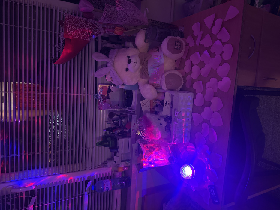 The scene depicts an indoor area, likely a room, characterized by pervasive artificial purple and blue ambient lighting. A wooden desk or shelf occupies the foreground, laden with celebratory decorations. A prominent, light-colored teddy bear, adorned with bunny ears and a beige bow tie, wears a pink sash inscribed "BIRTHDAY" across its chest. To its left, a smaller white teddy bear, wearing a miniature silver crown, is situated within a clear, reflective container. A rectangular, light-colored gift box is positioned directly in front of this smaller bear. The desk surface in front of the bears is covered with numerous scattered pink heart-shaped paper cutouts. To the right of the large teddy bear, multiple bouquets of flowers, including tulips and red-wrapped arrangements, are visible, along with a partially obscured red balloon. On the far left of the desk, a small, spherical light projector emits blue and purple light beams. The background features a window covered by closed horizontal blinds, revealing indistinct blurred lights from an exterior urban environment. The window sill below the blinds holds various miscellaneous items, including a bottle of "Devin" branded water, several cosmetic or liquid containers, and a small decorative mirror. The arrangement suggests a personal celebration. The location is determined to be within Plovdiv, Bulgaria, primarily indicated by the presence of the "Devin" brand water bottle, a product specific to Bulgaria.