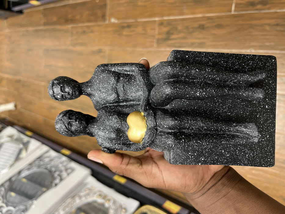 An indoor scene in what appears to be a retail environment in Mile 11, Ghana, depicts a dark-skinned hand holding a black, speckled resin statue. The statue portrays a stylized male and female figure seated side-by-side, jointly holding a prominent golden heart centrally between them. The background is blurred, showing a brown tiled floor to the right and a display shelf with out-of-focus merchandise and yellow markers to the left.