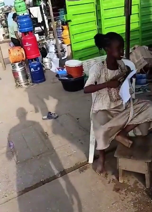 The video depicts a street scene in what appears to be a developing country. A person's shadow is prominently displayed as they record the scene. To the right, there is a small roadside stall selling cooking equipment and supplies, including a stack of brightly colored gas cylinders and various kitchenware. Several children are gathered around the stall, appearing to be either customers or simply observing the goods on display. In the background, there is a busy street with vehicles and pedestrians, indicating an active commercial area. The overall impression is of a bustling, informal economy at work.