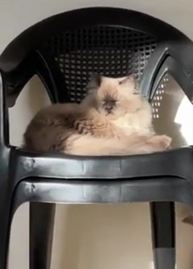 A fluffy, brown and cream-colored cat is sitting on top of two stacked black plastic chairs