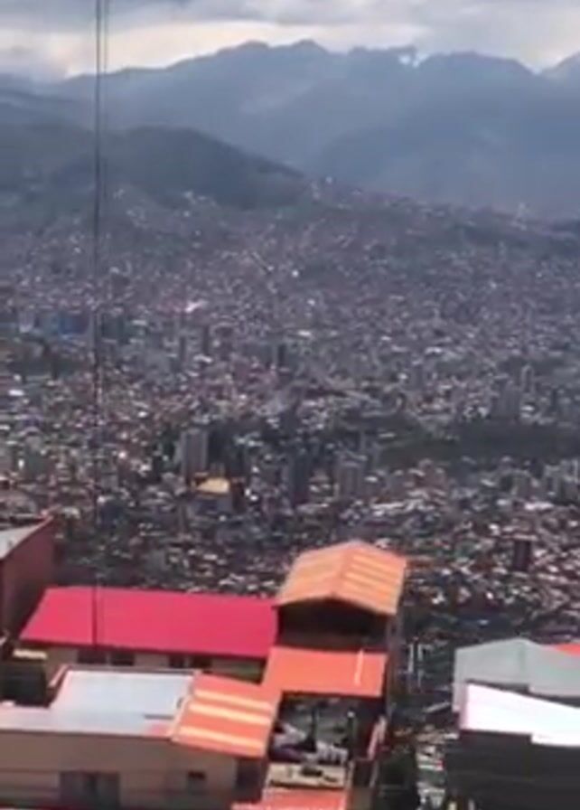 high-angle view of a densely populated city nestled in a valley, surrounded by mountains. The city is a patchwork of buildings, mostly low-rise, sprawling across the landscape. Some taller buildings are visible, piercing the urban expanse. The mountains in the background are rugged and partially obscured by clouds. In the foreground, there are a few buildings with brightly colored roofs. A cable car passes in front of the camera, obscuring part of the view momentarily. The sky is overcast with patches of sunlight breaking through.