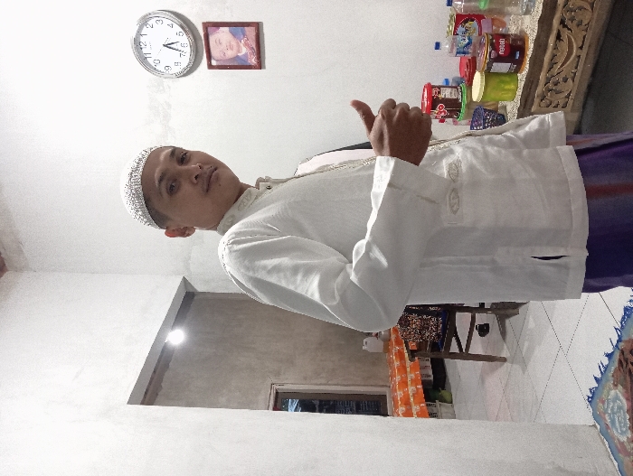 An image taken indoors in Bulukandang, Indonesia, depicts a male subject standing in a room with white walls and a light-colored tiled floor