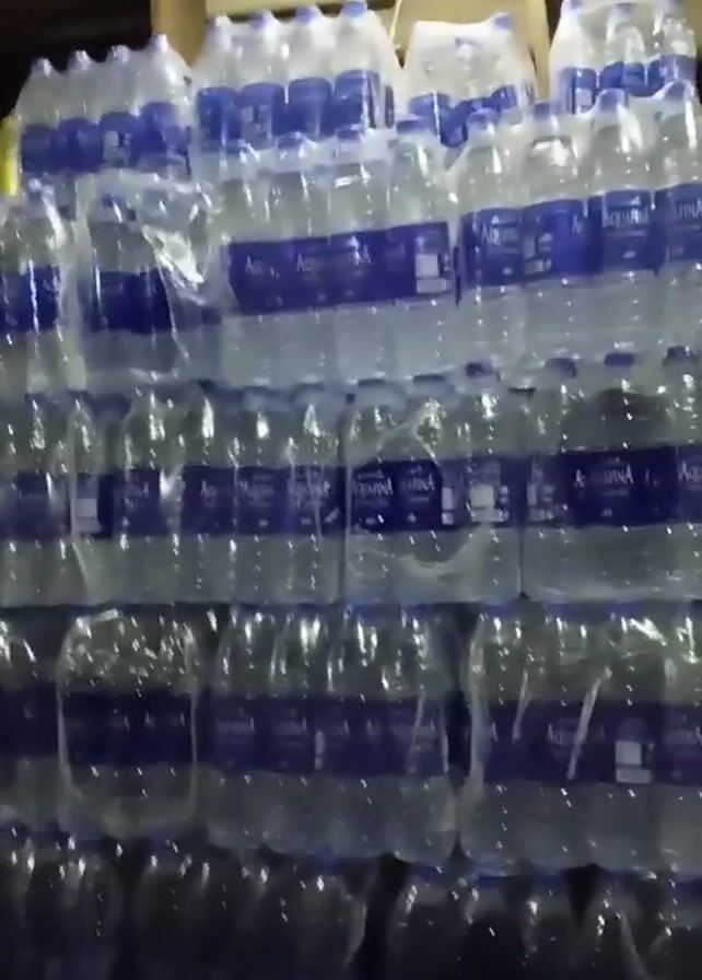 large stack of bottled water. The bottles appear to be in plastic wrapping, arranged in multiple layers. The labels visible on the bottles suggest the brand is "Aquafina". The environment is somewhat dimly lit, possibly a storage area or warehouse. Towards the top left, a few packages of what appear to be yellow liquids, are also visible. The camera moves slightly, briefly blurring the image.