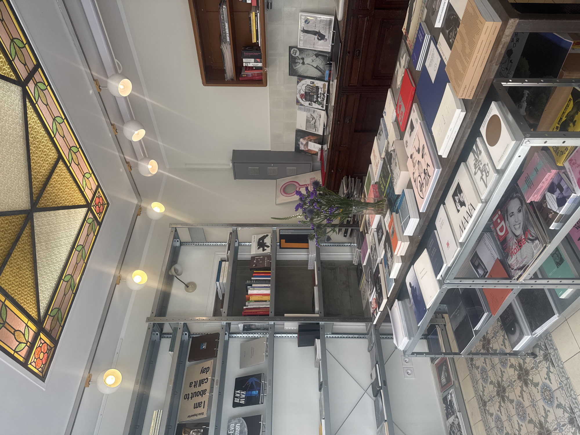 This is an interior view of a bookstore in Paris, France. The image is taken at an oblique angle, showing various shelving units filled with books, along with other furniture and decorative elements. On the left side, there is a stained-glass window. A line of track lighting is visible along the ceiling. Shelves along the wall hold books and various items. In the center of the image, a vase of purple flowers sits on a surface between shelving units. To the right, there is a wooden display cabinet filled with books. A metal shelving unit holds books facing outward, displaying their covers. The floor shows a patterned tile design. The scene is well-lit, creating a bright and inviting atmosphere. The bookstore seems organized and aesthetically pleasing, with a mix of modern and traditional design elements.