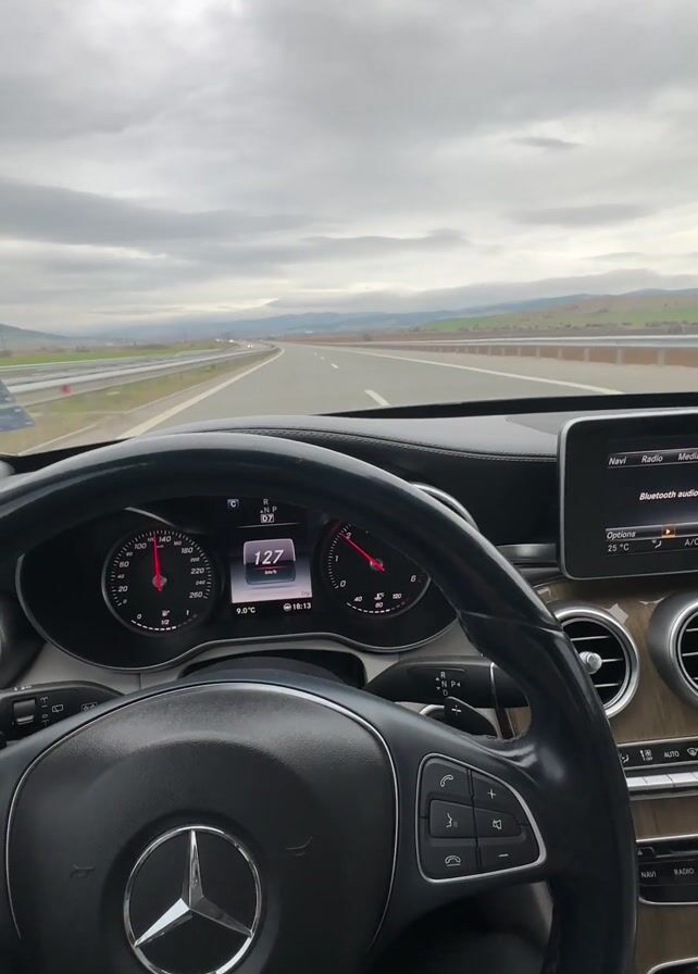 car, likely a Mercedes-Benz, driving on a highway. The view is from the driver's seat, focusing on the dashboard and the road ahead. The car's speed increases from 127 km/h to 138 km/h during the video. The dashboard displays the car's speed, RPM, time, and outside temperature (9°C). The infotainment system shows "Bluetooth audio device connected." The road is straight and relatively clear, with a few other cars visible in the distance. The sky is overcast with a backdrop of distant hills. The interior of the car features a dark steering wheel, a wooden-trimmed dashboard, and silver air vents.
