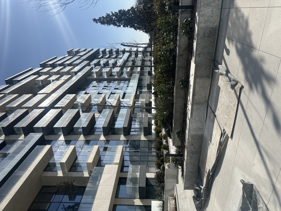The scene depicts a modern architectural complex in Sofia, Bulgaria, under clear, bright daylight. A multi-story building, likely a residential or office structure, dominates the background, characterized by a contemporary design featuring numerous staggered balconies with glass railings and large, reflective windows. The facade alternates between light-colored concrete or stone and darker structural elements. In the foreground and midground, a paved outdoor plaza with light-colored square tiles extends across the scene. This area incorporates several raised concrete planters filled with low evergreen bushes and multiple slender, bare deciduous trees, suggesting late autumn, winter, or early spring. Dark, cylindrical ground-level light fixtures are interspersed within the planters. On the tiled pavement in the lower left, remnants of construction materials are scattered: two flat, light-colored rectangular panels, possibly plywood or insulation boards, lie adjacent to crumpled sections of dark gray sheeting or tarp. The sky is a vivid, clear blue, with visible sun glare in the upper right quadrant, indicating strong sunlight that casts distinct shadows from the building and ground objects. A tall, dark evergreen tree stands prominently on the right side of the frame, towering above the landscaping. No individuals are present in the image.