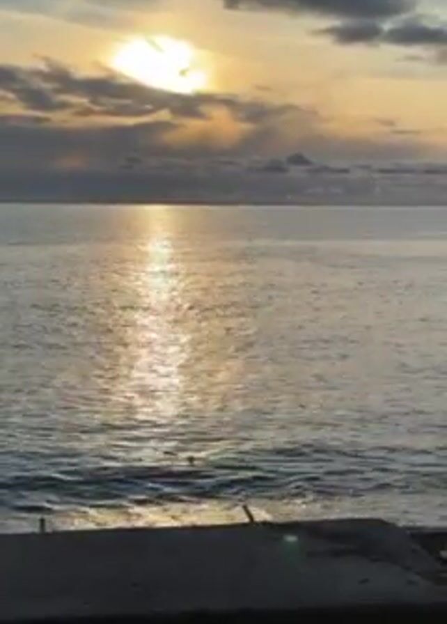 sunset over the ocean. The sun is partially obscured by clouds, casting a bright reflection on the water. The sky is a mix of blue, grey, and orange hues. Small waves gently lap against a concrete barrier in the foreground.