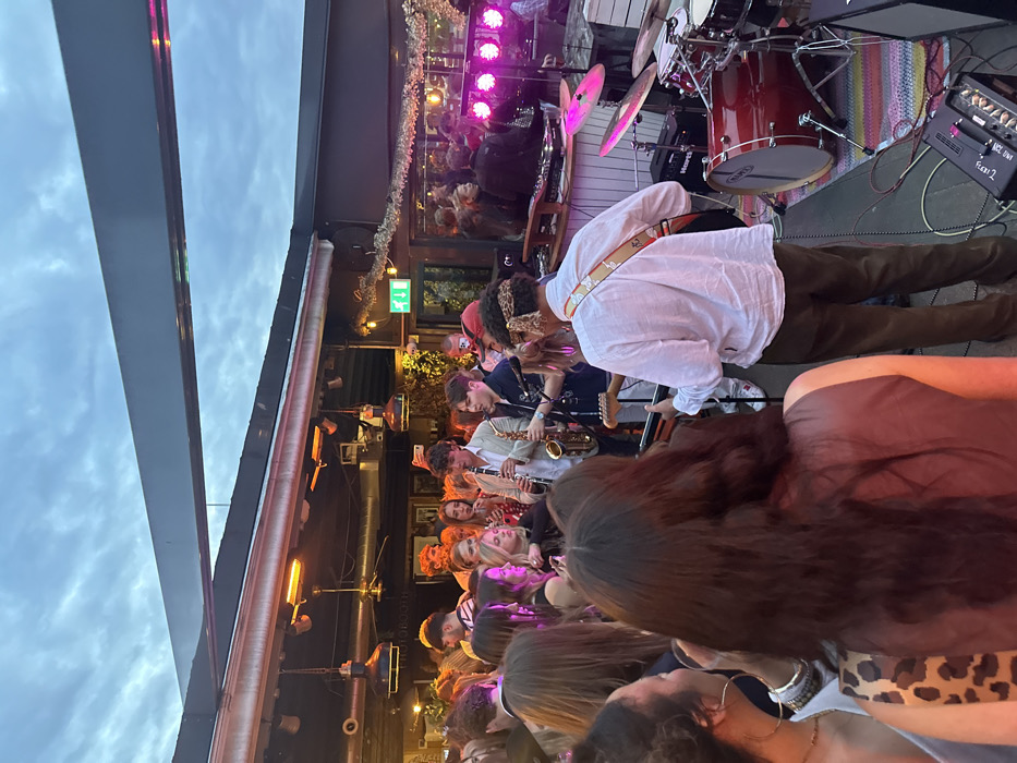 The scene is an outdoor patio bar in Newcastle upon Tyne, UK, with a live band performing for a crowd of people