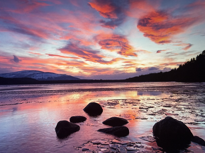 A serene lake scene unfolds at sunset. Rocks dot the water's surface, surrounded by fractured ice. The sky explodes in vibrant hues of pink, orange, and soft blues, mirrored in the lake's calm surface. Distant mountains, some snow-capped, frame the horizon, while a silhouette of trees lines the right edge, completing the picturesque landscape.