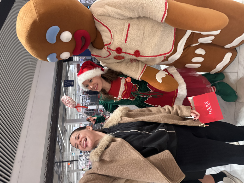 Three individuals pose for a photo. A large gingerbread man costume looms above, with two women below. One woman is dressed in a Christmas elf costume, complete with a Santa hat and a large lollipop. The other woman wears a beige coat and black leggings. A red shopping bag with the word "Nocibe" is visible in her hand. The scene appears to be in a well-lit, commercial setting.