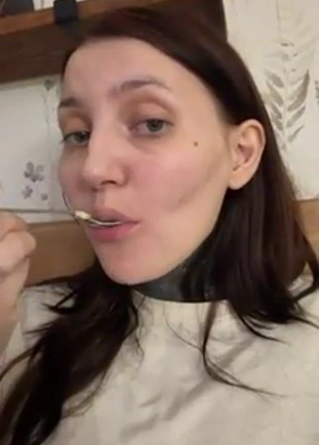 A woman with long, dark brown hair is eating something from a spoon. She's wearing a white shirt and has hoop earrings. Her skin is pale, and she has some visible veins. A tattoo is visible on her neck. The background includes a wall with a floral pattern and a wooden shelf. There is audio of a male voice speaking in Russian.