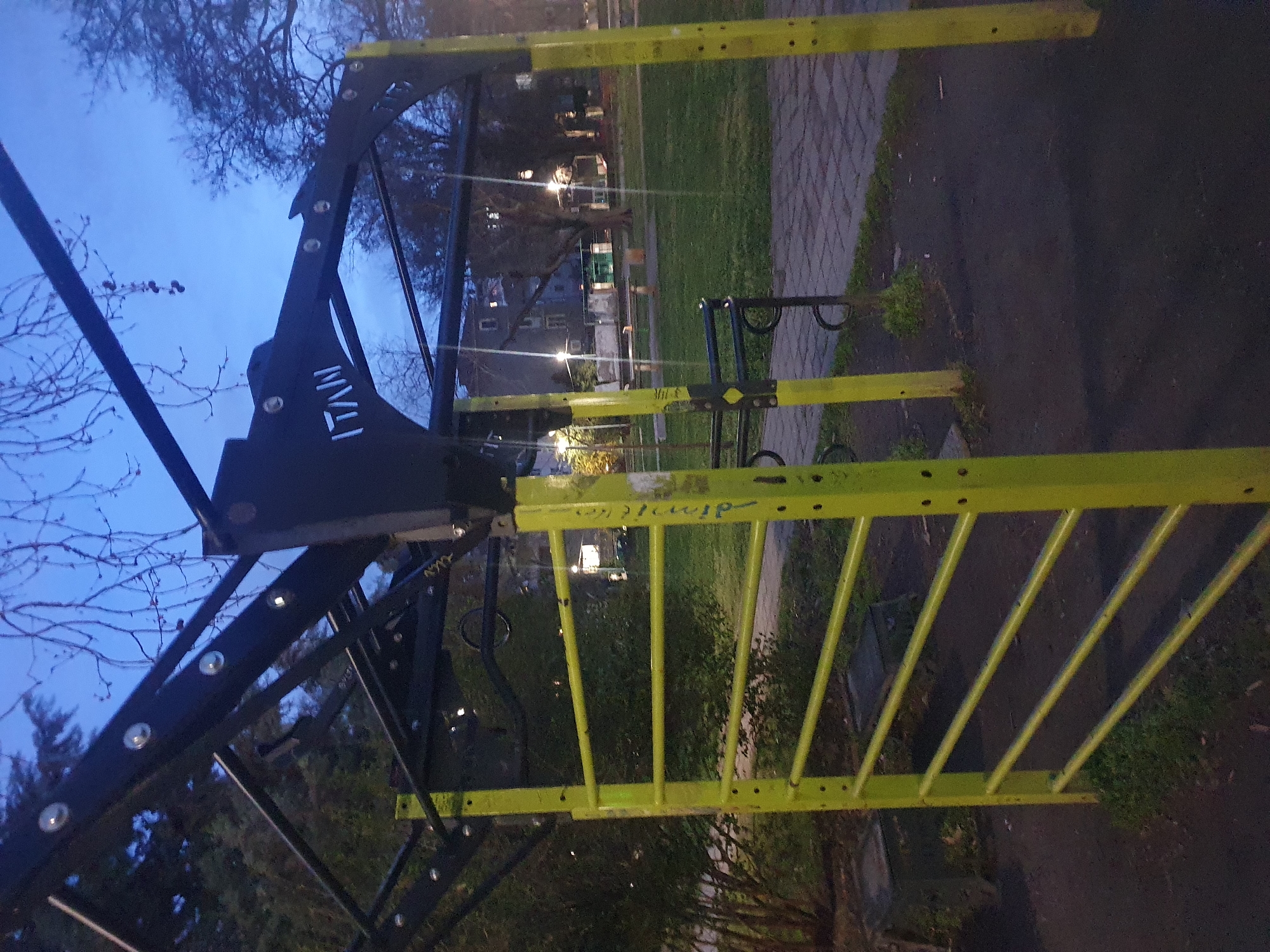 The image depicts outdoor fitness equipment in Plovdiv, Bulgaria, likely in a park or public space. The equipment features a black metal climbing structure and a yellow metal ladder with rungs. The ground is a mix of pavement, grass, and dirt. Bare trees are visible in the background against a dusk sky. A building with lit windows is visible further back. The fitness equipment appears to be manufactured by the company, "ITALI," as marked on a metal component of the structure. Graffiti is visible on the yellow ladder.