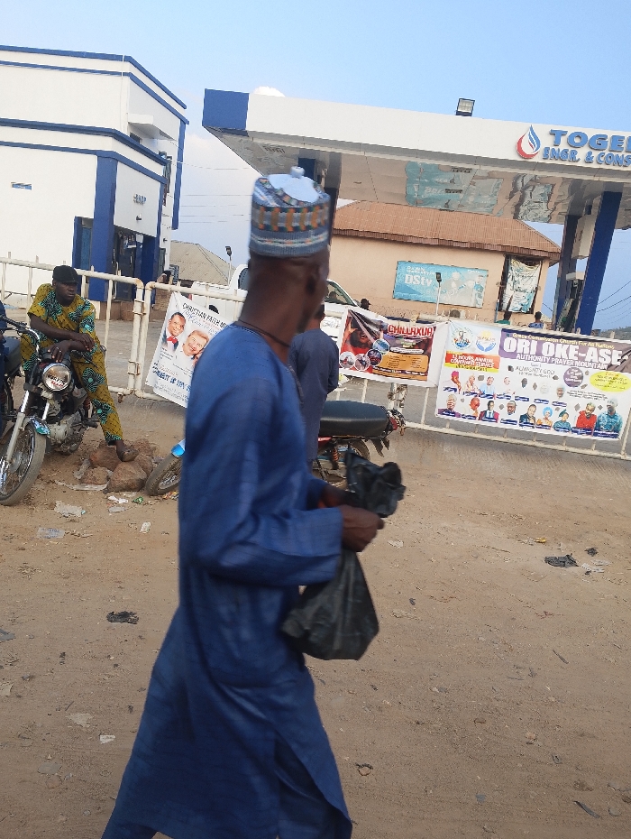 A man wearing a blue robe and a traditional cap walks by a gas station. Another man sits on a motorcycle in the background. Banners advertising Christian faith, DStv, and Ori Oke-Ase Authority Prayer Mountain are visible behind a barrier. The gas station is branded with "TOGEL ENGR. & CONS." The ground appears to be sandy or dirt.