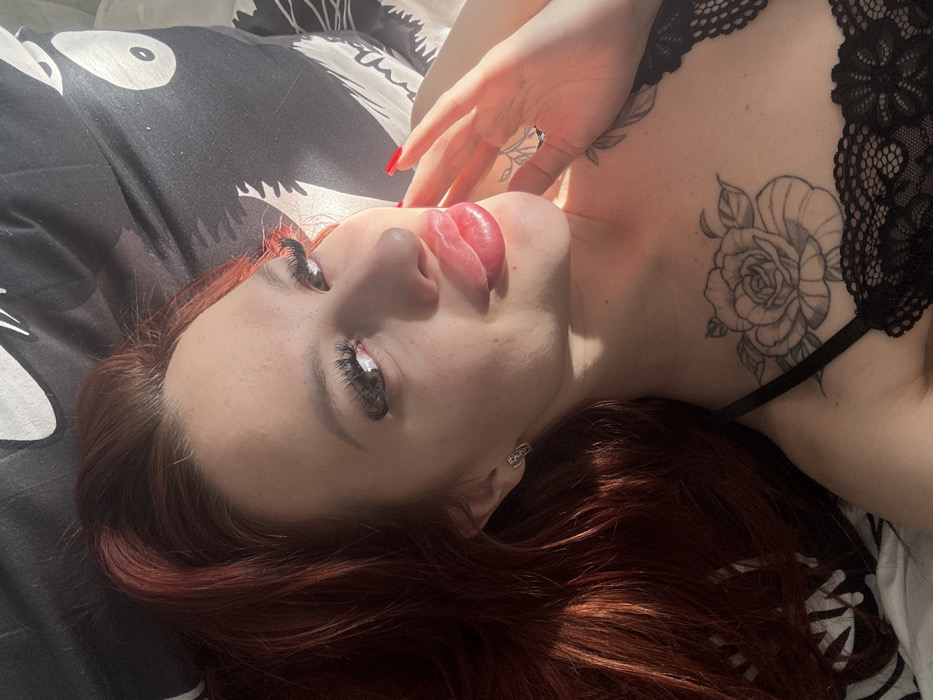 An individual is depicted indoors, lying on patterned black and white bedding, likely a pillow, in Перовское сельское поселение, Ukraine. The subject is a female with reddish-brown hair, prominent false eyelashes, and notably full lips. She is positioned looking upwards and to her left, with a subtle smile. Her visible left ear has a small stud earring. Her right hand, featuring red fingernail polish, is near her face. A large rose tattoo is present on her upper chest, and portions of a leafy tattoo are visible on her right forearm. She is wearing a black lace bralette or top. Direct sunlight illuminates the right side of her face and upper body, creating distinct shadows.
