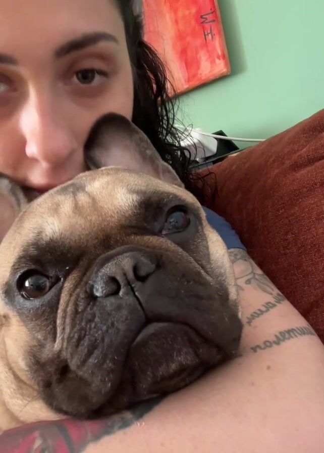A woman with dark, curly hair is holding a brown French bulldog in her arms. The dog's head is resting on her arm and it is looking at the camera. The woman is also looking at the camera. She has a lip piercing and tattoos on her arm. They are sitting on a brown couch in a room with green walls. There is a red painting hanging on the wall behind them. The woman yawns.