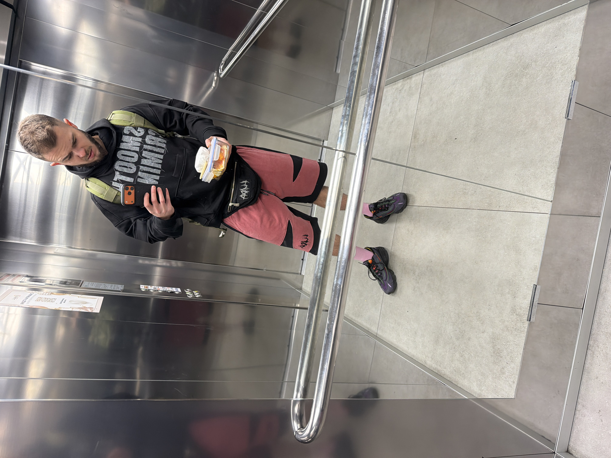 A man stands inside a stainless steel elevator, holding a phone in his left hand and a clear container with food in his right. He wears a black hoodie with white text, pink shorts, a green backpack, and black sneakers with pink socks. The elevator has handrails and informational posters. The floor is tiled in gray. The image is taken inside the Sofia Ring Mall located in Pernik, Bulgaria.