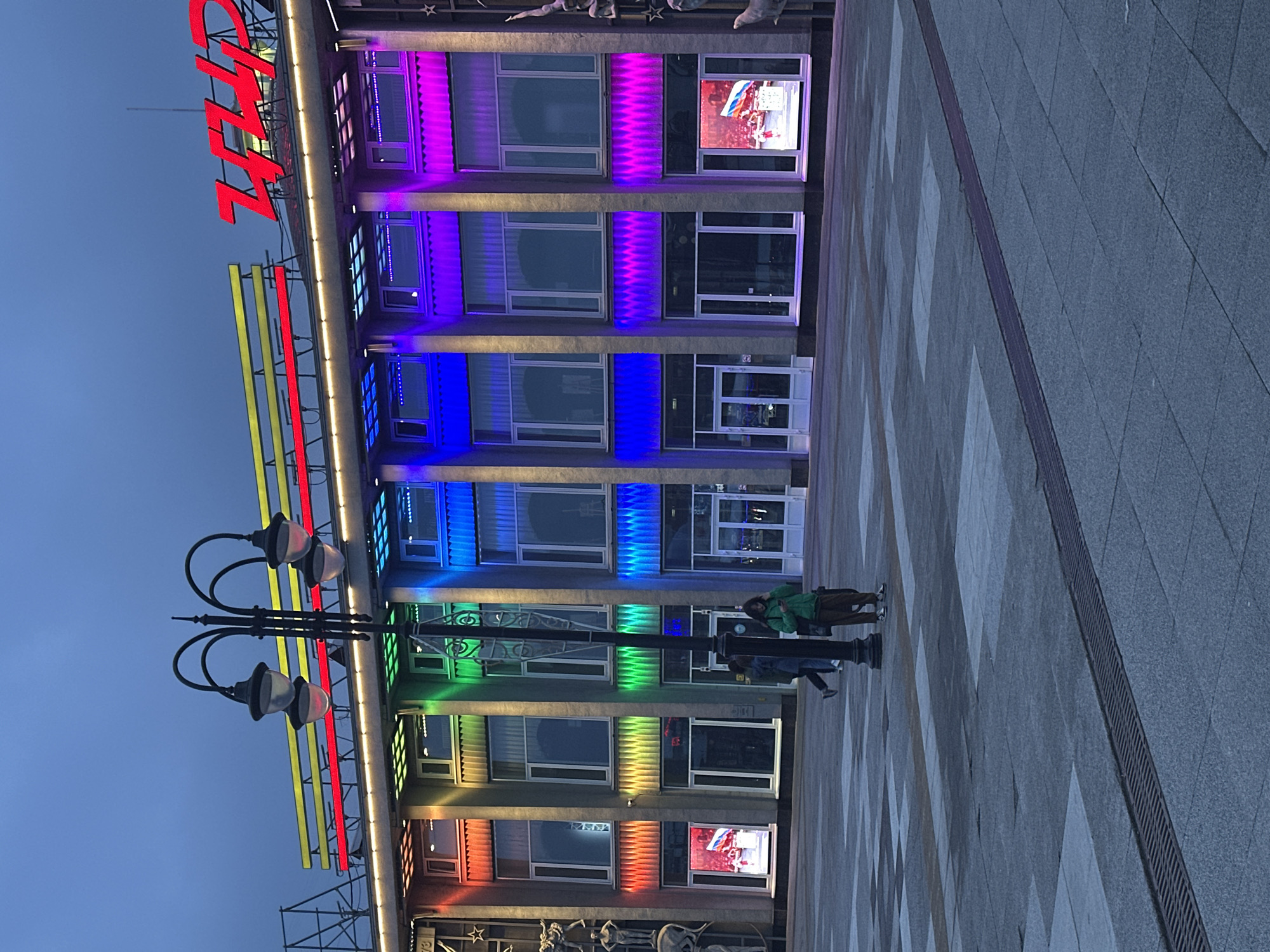 The image depicts the "City" cinema in Saratov, Russia. The building has a modern architectural style with a symmetrical facade divided into several floors. Each floor is illuminated with vibrant colors of the rainbow, transitioning from red at the bottom to purple at the top. A bright red sign with the word "CITY" is visible on the roof of the building. There are decorative sculptures on the bottom. In front of the building is a patterned stone pavement and a black ornate lamppost. Several people are standing on the pavement near the entrance of the cinema. The sky is a pale blue, suggesting it is either dawn or dusk.