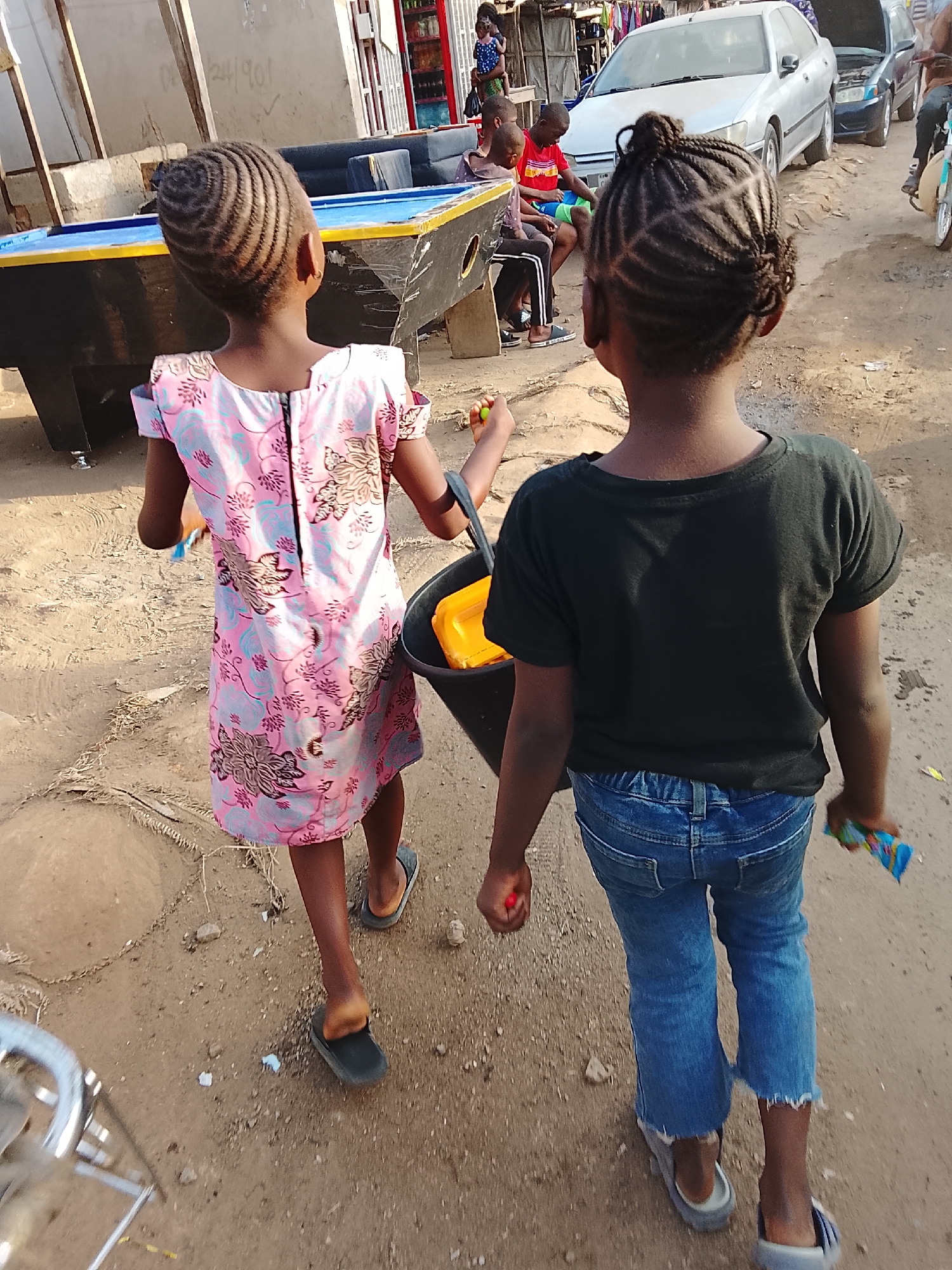 Two dark-skinned children walk away from the camera on an unpaved, light brown dirt road, consistent with a street scene in Abuja, Nigeria, likely in a bustling, less-developed district or suburb. The child on the left wears a short-sleeved, pink dress patterned with blue and brown floral designs, featuring a visible zipper running down the back. Her hair is styled in intricate, concentric circular cornrows. She wears dark-colored flip-flops and holds a small, light-colored object in her left hand. The child on the right, slightly taller, wears a dark short-sleeved t-shirt and light blue denim jeans with frayed hems. Her hair is styled in braids gathered into a bun at the back, revealing a distinct star-like pattern of cornrows on her scalp. She wears grey and white slide sandals. Her left hand carries a black bucket containing a bright yellow object, and her right hand holds a colorful, rectangular packaged item. The immediate ground is uneven, characterized by visible dirt, small stones, and tire tracks. A metallic, chrome-like object, possibly a part of a chair or railing, is partially visible in the bottom left foreground. In the midground to background, various elements define the urban environment. To the left, a black and blue billiard table with yellow trim is positioned outdoors on the dirt. Its blue surface appears worn. Several dark-skinned males, including at least three young individuals, are seated or standing near the table. One male wears a red short-sleeved shirt and green shorts. Behind them, a light-colored building wall displays faint numerical markings, including "08 /24 /901". To the right, a silver sedan, likely a Peugeot 406 model, with a missing front bumper, is parked on the dirt road. Behind it, a dark blue sedan is parked with its hood open, suggesting maintenance or a breakdown. Further right, parts of a motorcycle and its rider are visible. Beyond the vehicles, several makeshift storefronts or stalls line the street. One prominent stall features shelves displaying various colorful packaged goods, possibly beverages. Clothes are seen hanging near another stall. The scene is brightly illuminated by natural sunlight, indicating daytime conditions.