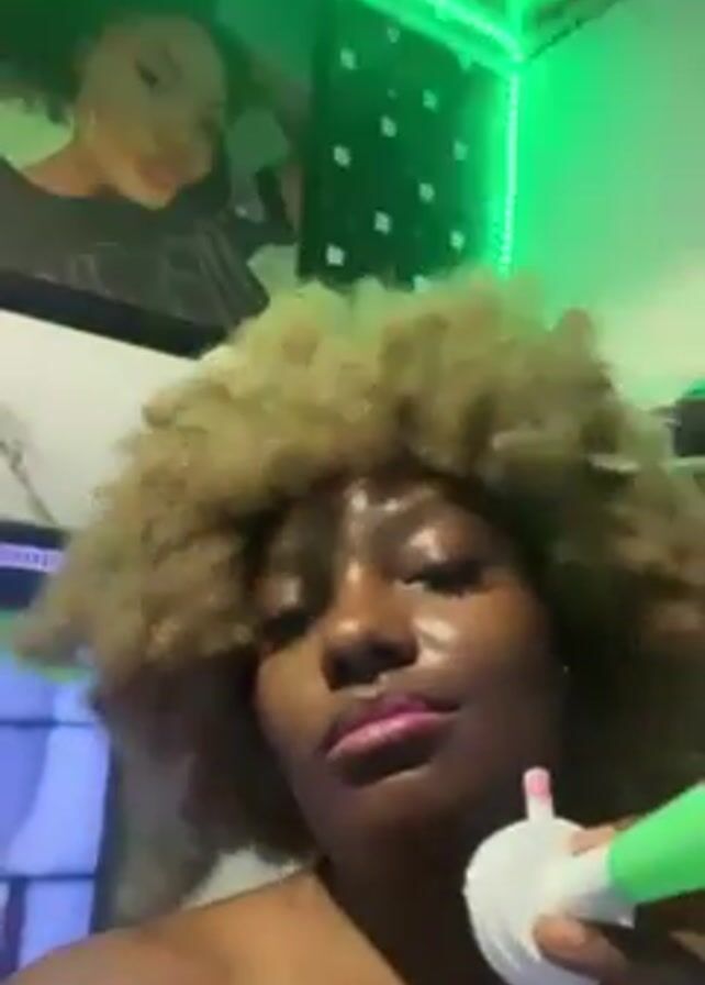 person with curly, light brown hair blowing into a green and white party horn. They are looking directly at the camera. The background is a room with posters and LED lights. The lighting shifts between red and blue. The person appears to be indoors. They smile at the camera.