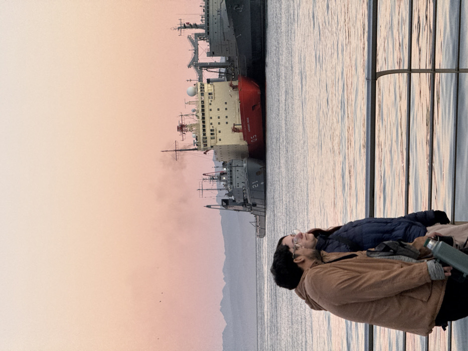 The image depicts a twilight scene at the port in Ushuaia, Argentina. In the foreground, a dark-haired male wearing a brown hooded jacket and glasses, holding a green thermal bottle, stands next to a female with long dark hair, glasses, and a dark blue puffer jacket. Both individuals are positioned left of center, facing towards the right, looking out over calm, reflective water. A metal railing forms the immediate foreground barrier. In the mid-ground, three large vessels are docked in the bay. From left to right: a grey vessel marked "21" on its hull, a prominent red-hulled icebreaker with a white superstructure labeled "05" and "ALMIRANTE IRÍZAR" from which dark smoke is emanating, and a partial view of a dark grey vessel. Distant mountains are visible across the water line. The sky above is a gradient of light pink to pale orange, indicating either sunrise or sunset.