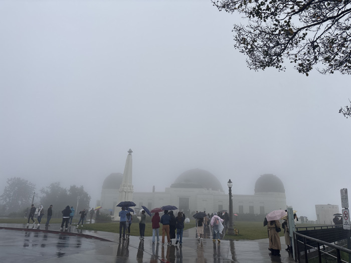 A foggy day at Griffith Observatory with many people holding umbrellas