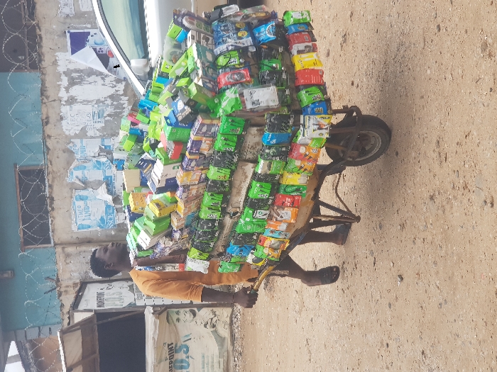An adult male is observed pushing a heavily laden, single-wheeled wheelbarrow along an unpaved, dirt ground in Lokoja, Nigeria. The wheelbarrow, appearing yellowish and weathered, is completely filled and overstacked with hundreds of small, rectangular, brightly colored packaged items, predominantly green, blue, yellow, red, and white. Many items are also suspended from the sides of the wheelbarrow's bed in blister packs, suggesting electronic accessories like chargers or earbuds. The man, with dark skin, wears a long-sleeved orange shirt and dark flip-flops. He is positioned behind the wheelbarrow, gripping its handles, and appears to be moving forward, his gaze directed slightly to his right. In the background, a concrete building wall is visible, painted light blue-green at its upper portion. The wall is covered with multiple faded and torn white posters featuring dark text, with some partial legibility of "JAMB" and "SSCE." Barbed wire runs horizontally along the top of this wall. To the immediate left, a small, open-fronted wooden stall structure with a white banner displaying "MODERPOINT P.O.S." is present. To the right of the wheelbarrow, the front fender and headlight portion of a silver sedan are visible. The scene is illuminated by daylight.