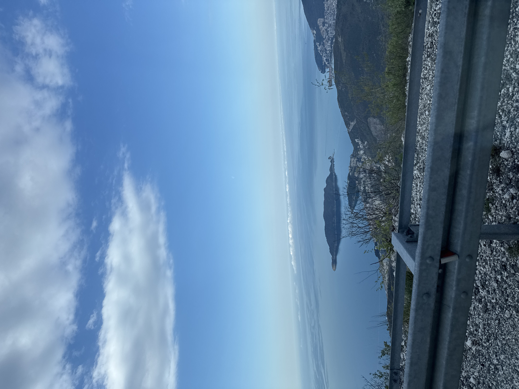 A landscape view from a high vantage point, likely near the city of Brajici, Montenegro, captures the Adriatic Sea under a bright blue sky with scattered white clouds. The body of water stretches toward the horizon, displaying a subtle atmospheric haze. Along the right side of the image, a metal guardrail runs parallel to a hillside covered with vegetation and exposed rock. In the distance, coastal settlements dot the shoreline. A distinct, elongated island or land formation stands out in the sea. The image suggests a roadside view from an elevated position overlooking the sea.
