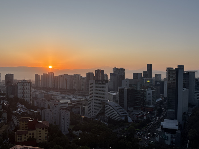- "The image displays an elevated panoramic view of Mexico City at sunrise, specifically looking generally west from an elevated position within the Bosques de las Lomas district towards the Santa Fe financial and commercial area" by FM-21Qs12, licensed under CC BY 4.0