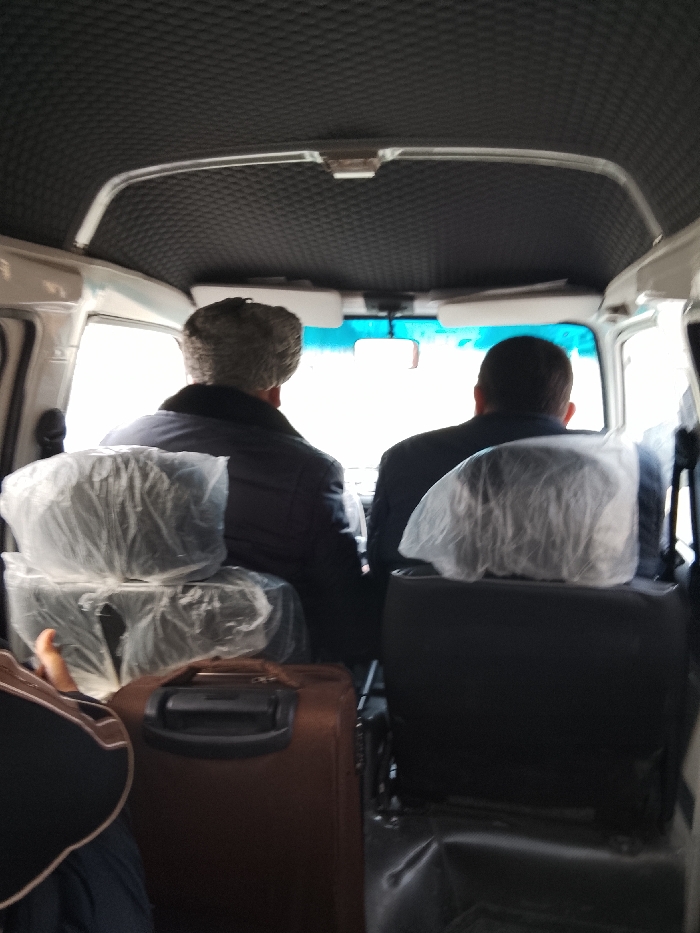 Inside a vehicle, likely a van, two men face forward. The man on the left wears a dark jacket and a grey fur hat. A brown suitcase sits behind him. The man on the right wears a dark blazer. The seats are covered in plastic. The vehicle's interior includes a textured ceiling and a rearview mirror. The view through the windshield is bright, possibly from daylight.