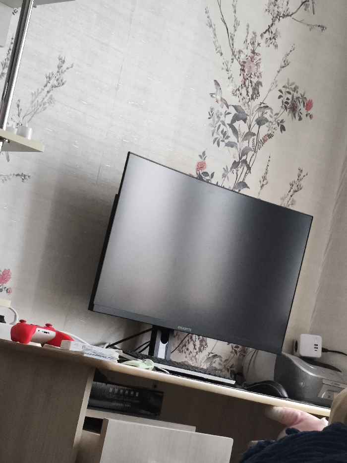 The image displays an indoor workstation in Kurovskoye, Russia. A black GIGABYTE monitor with a dark, reflective screen is centrally positioned on a light-colored wooden desk. To the left of the monitor, a red and white PlayStation DualSense controller rests on the desk surface. A black computer keyboard is situated directly in front of the monitor, and a silver/grey computer mouse is visible to the monitor's right, near a white USB power adapter plugged into an outlet. Below the desk, a black electronic device is stored within a compartment. The wall behind the desk is covered in light-colored wallpaper featuring a repeating botanical pattern of branches, leaves, pink flowers, and small birds. In the upper left quadrant, a chrome vertical support column and a light-colored shelf holding two small white objects are partially visible. A human arm, covered by a dark blue ribbed sleeve, is partially visible in the lower right corner of the frame, indicating the presence of an individual seated at the desk.