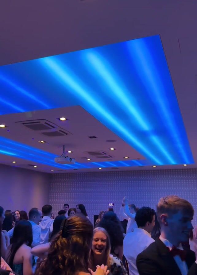 crowd of young people dancing at what appears to be a formal event, possibly a prom or party. Most of the people are dressed in formal wear, including dresses, suits and tuxedos. The camera is in the midst of the crowd. The room is decorated with blue ceiling lights and spotlights. People are seen dancing, talking, and laughing.