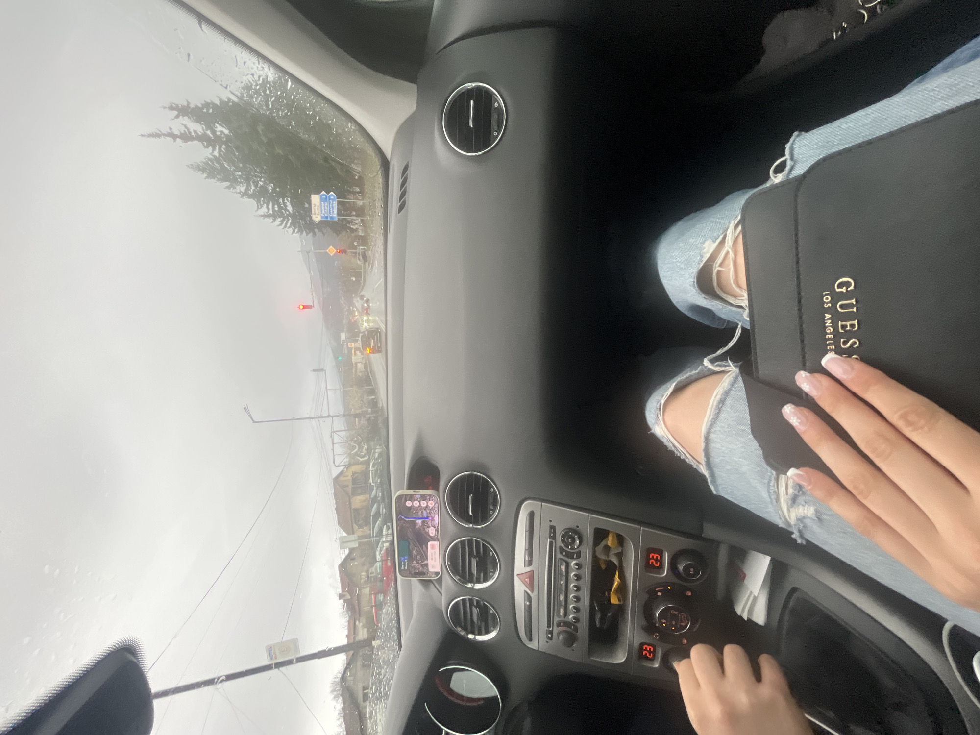 From the perspective of inside a car, a driver is navigating a city street in Dragichevo, Bulgaria. Visibility is limited due to heavy fog. A navigation app on a smartphone, mounted on the dashboard, displays a route. The driver is wearing ripped jeans and a "GUESS Los Angeles" handbag is placed on their lap. The car's radio display shows "23". Street signs are visible outside. There is a traffic light that is red.