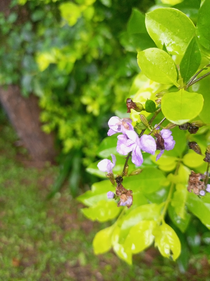 The image displays a close-up of light purple flowers and vibrant green leaves, located in Beni, Nepal. Water droplets cover the surfaces of both the flowers and leaves, indicating a wet environment. The primary subject features a cluster of small, tubular, light purple (lavender) flowers, some showing brown desiccation on their petals, attached to a slender stem. This stem also bears smaller green leaves and buds. Surrounding these flowers are broad, glossy, bright green leaves. The background is intentionally blurred, featuring indistinct green and yellow-green foliage. In the far upper-left, a partially obscured, elongated, indistinct brown object, potentially wood or concrete, is visible against a heavily blurred green ground cover or grass. No human subjects, animals, or specific actions are depicted.