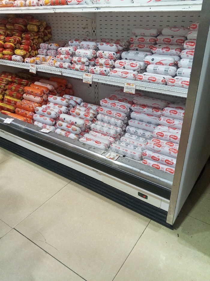 A refrigerated supermarket shelf is stocked with various meat products. Top shelves display a variety of sausages, including orange-wrapped and red-wrapped options, along with Alibal-branded products. The lower shelves are filled with numerous rolls of Alibal-labeled meat, neatly stacked. Price tags are visible, indicating the cost of the items.