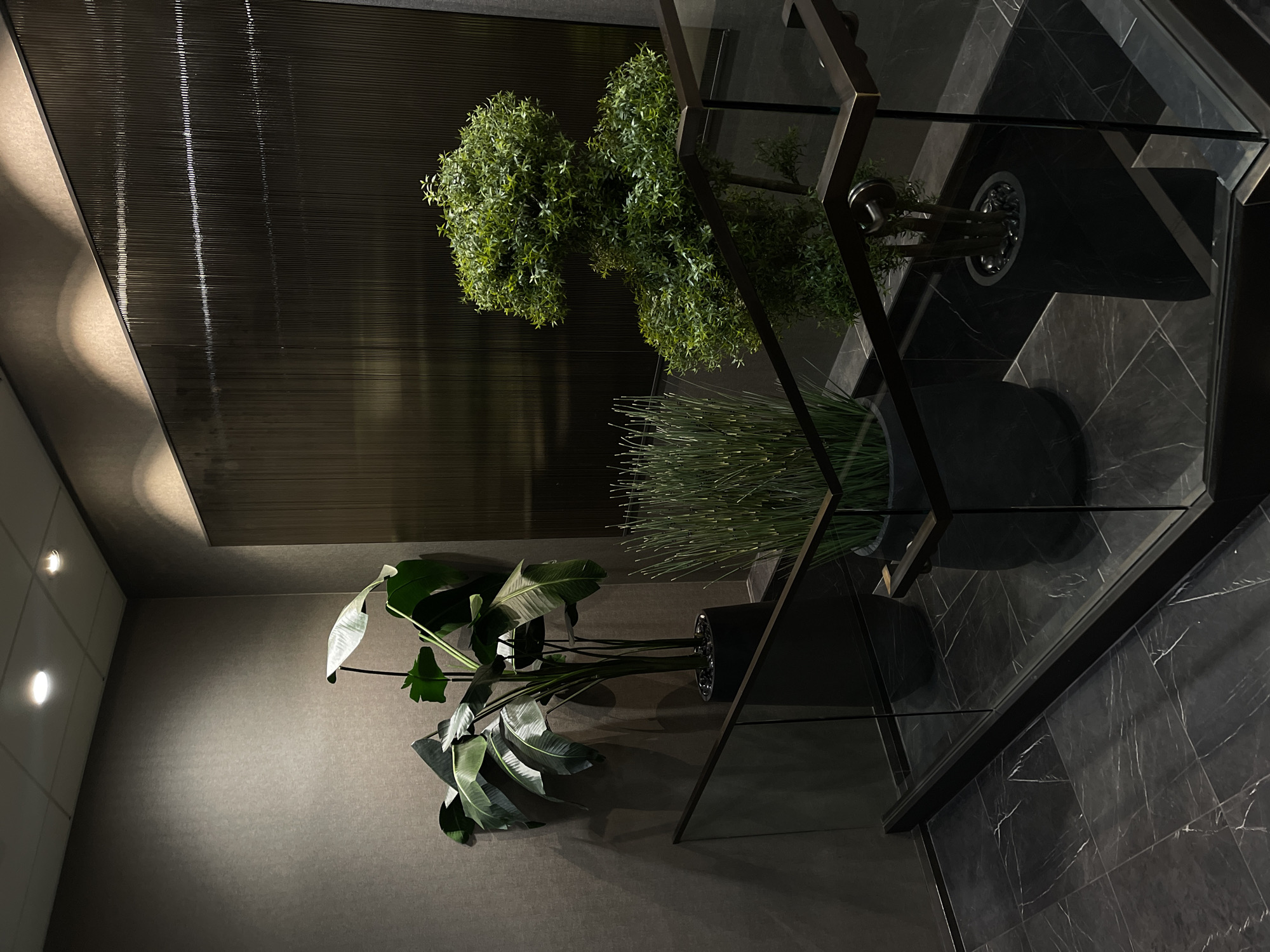 The image presents an interior scene featuring various potted plants arranged within a modern space. At the lower left, a plant with large, green leaves extends out from a pot situated against a neutral-toned wall. Above this, a dense, spherical plant with small leaves sits atop a shelf or stand. To the right, another potted plant with slender, grass-like foliage is partially visible. These plants are positioned within a structure with a dark, metallic frame and reflective surfaces. The background showcases a wall with a textured, linear pattern, creating a sense of depth. The floor is covered in dark tiles with a marbled pattern. The lighting appears to be a mix of natural and artificial sources, contributing to the overall ambiance. The exact location within Irvine, United States of America cannot be determined from the visual information provided.
