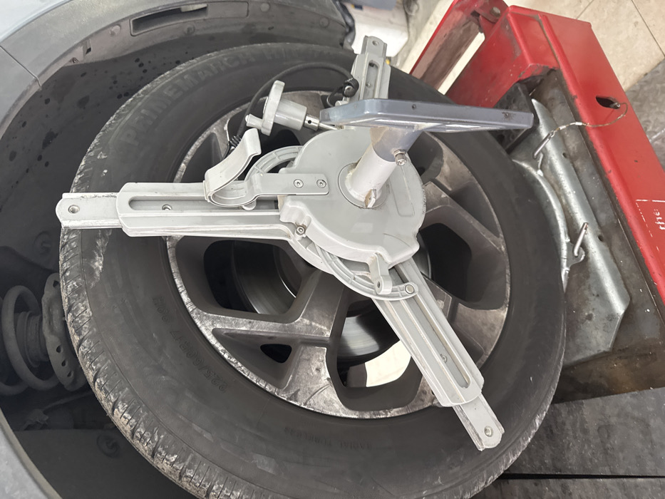 - "The image displays the front-right wheel of a vehicle undergoing an automotive service, specifically a wheel alignment or balancing procedure, within a workshop located in Tira, Israel" by FM-La8Z13, licensed under CC BY 4.0