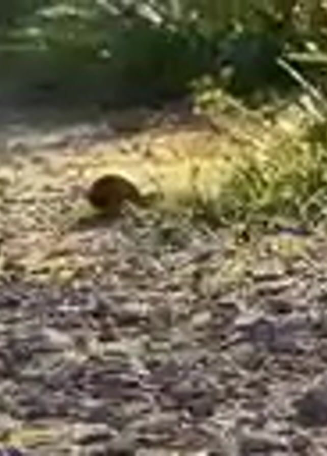 A small, dark-colored animal, possibly a mouse or vole, scurries along a gravelly path near a patch of green grass