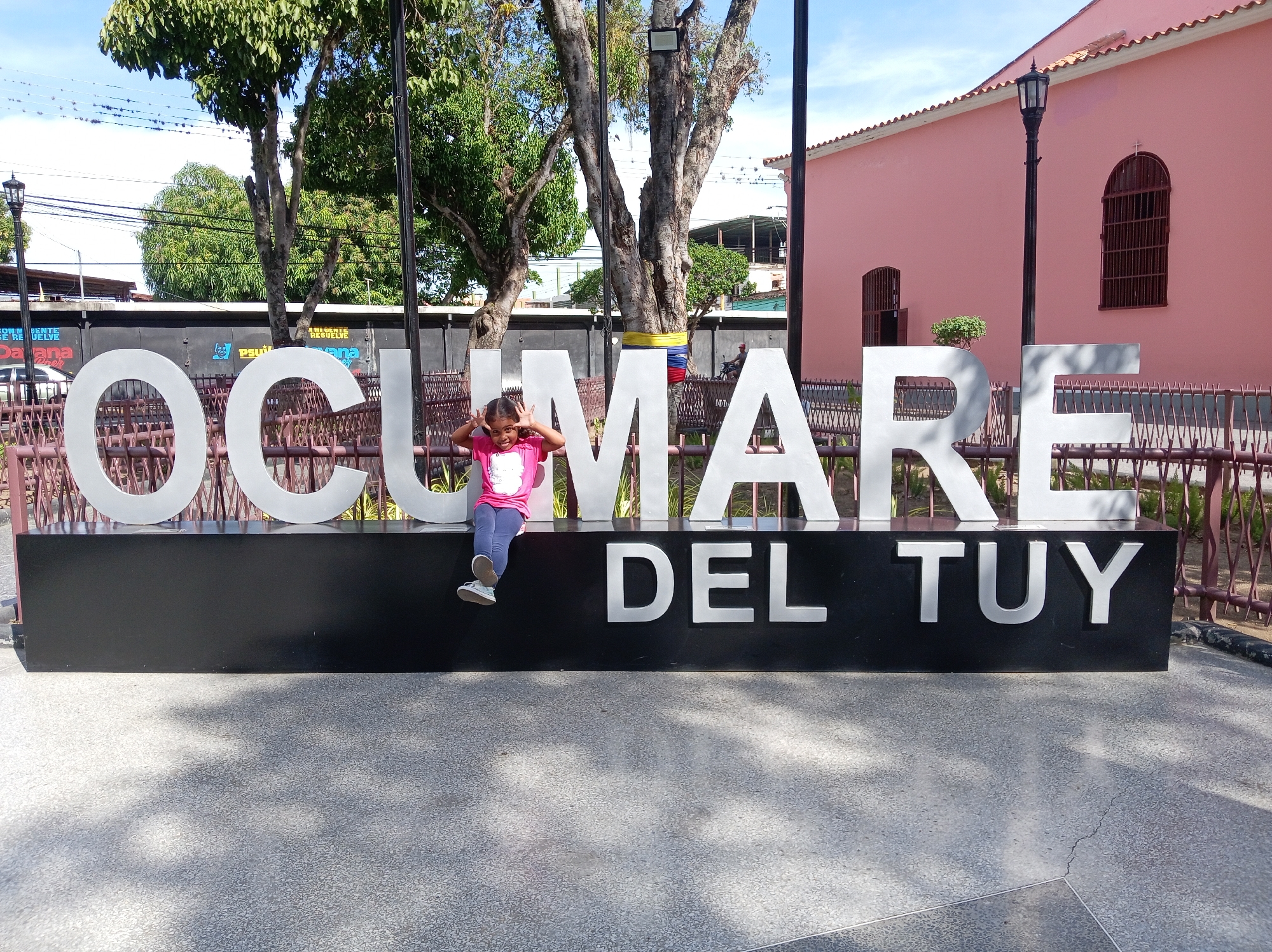 An outdoor, eye-level shot depicts a child sitting on a monument sign in Ocumare del Tuy, Parroquia Ocumare, Venezuela