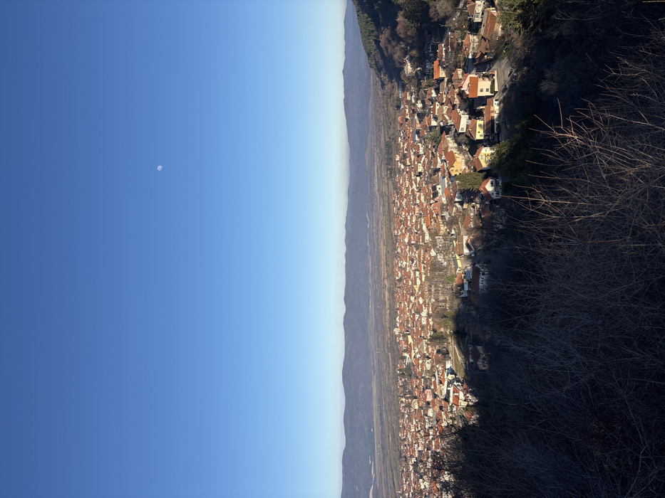 An elevated, wide-angle view captures the town of Kostenets, Bulgaria, situated within a valley. The upper half of the image features a clear, deep blue sky with a distinct, faint crescent moon visible in the upper right quadrant. The lower half of the image depicts the town, characterized by a dense concentration of residential and commercial structures, predominantly featuring red or terracotta tiled roofs. The buildings vary in color, ranging from white and cream to yellow and light orange, and appear to be illuminated by direct sunlight, casting shadows. In the immediate foreground, a dark, shadowy area of leafless deciduous tree branches or shrubs occupies the lower third of the frame, partially obscuring the closest buildings. Beyond the town, the valley floor extends horizontally, showing a mosaic of muted green and brown terrain, suggesting fields or sparse vegetation. This valley is bordered by several layers of distant, hazy blue-grey mountain ranges under the clear sky. No individuals, specific actions, or interactions are discernible within the scene. The lighting indicates bright daylight, with the sun positioned to cast shadows from the viewer's right, illuminating the town and background.