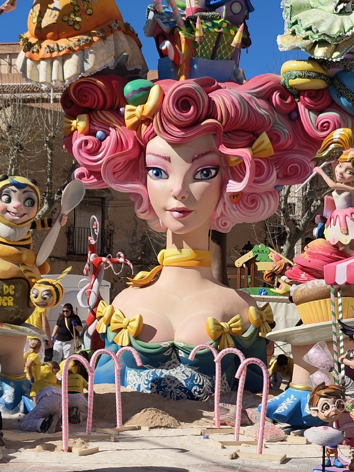 An outdoor scene in Dénia, Spain, depicts a large, colorful, multi-component monument, likely a Fallas or Hogueras ninot, under construction or display. The central subject is a towering female bust with light skin, blue eyes, and voluminous pink, curly hair styled with yellow bows and candy-like ornaments. She wears a yellow choker and a blue, patterned gown with yellow bows across the bustline. Surrounding the central figure are various oversized, sweet-themed elements. To the left, a large, smiling bee-person figure in yellow holds a white spoon. Below it, a smaller bee figure is visible. Further left, a large, light brown container labeled "DE MIEL" (of honey) is present. To the right of the central bust, sections of pink and white desserts, including cupcakes and macarons, are integrated into the monument. A structure resembling a candy house with various sweets on its roof is visible in the upper right. Several large, red and white striped candy canes are positioned vertically around the base of the monument, some secured with wooden blocks in the sandy ground. At the base of the monument, an uneven layer of sand covers the ground. Several individuals are present: one person in a black shirt and white pants stands near a large red and white striped structure, holding a tool resembling a shovel or rake. Multiple other individuals, some wearing yellow shirts, are situated around the base of the monument, bending or kneeling, suggesting work or inspection of the structure. The background includes blurred architectural elements of city buildings and bare tree branches under a clear blue sky.